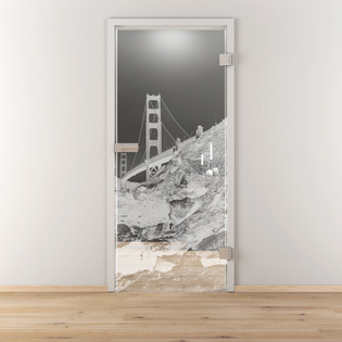 Per Lasertechnik können photorealistische Motive auf Glas graviert werden. So wird die Tür zum Bad zum stimmungsvollen Entrée.